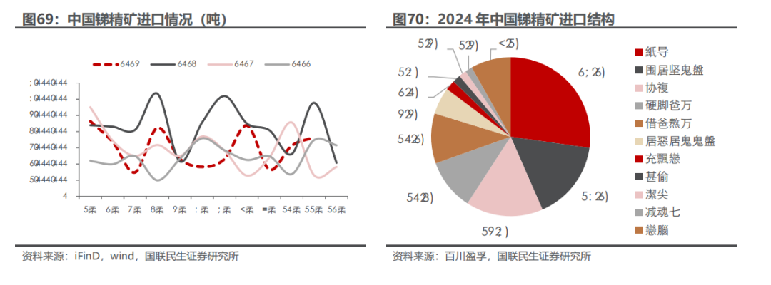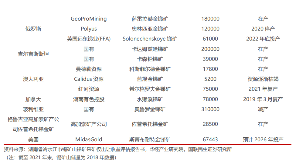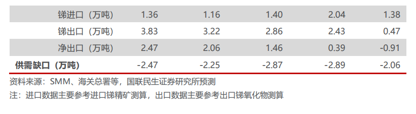 锑是全球稀有的有色重金属,呈现为银白色,常制成棒、块、粉等多种形状,易溶于王水,溶于浓硫酸,锑性脆易碎,无延展性,同时是热和电的不良导体,导热率和导电率仅为铜的1/20和1/27,在自然界中主要存在于硫化物矿物辉锑矿(Sb2S3)中,是中国的优势矿产资源,主要应用领域为阻燃剂、铅酸蓄电池、光伏玻璃等。锑在工业制造中常被用作添加剂,被称为“工业味精”。从锑产业链来看,中游深加工方面,锑矿经过冶炼加工得到氧化锑、乙二醇锑、锑合金等产品,氧化锑又可继续加工为焦锑酸钠等产品。 下游应用方面,氧化锑主要与卤素阻燃剂配合应用于塑料、纺织物;铅锑合金主要应用于铅酸蓄电池阳极板栅;焦锑酸钠主要应用于玻璃澄清剂;乙二醇锑是工业制备聚酯化合物的主要催化剂。另外,锑在红外镀膜市场、掺杂市场等高科技领域也有广泛的应用。由于锑的化合物有较多用途,锑化合物的耗锑量已超过锑合金的耗锑量。 中国的锑矿资源储量位居全球第一位。根据USGS数据,2024年全球锑矿储量约223万吨,中国锑储量达67万吨,约占全球的31%,俄罗斯锑储量达35万吨,占全球比重约16%。锑在地壳中的含量很低,且极难富集,主要以硫化物及硫盐矿物的形式存在,目前已知的矿物和含锑矿物有120余种,但具有工业利用价值的仅10多种。 中国锑矿资源主要分布在湖南、广西两省,储量分别占全国的25.2%和20.9%。其中湖南具有我国最大的锑矿山——湖南省冷水江市的锡矿山锑矿田(湖南闪星锑业全资矿山)。根据美国地质调查局数据,我国锑矿储量由2015年的95万吨下降至2022年的35万吨,2023-2024年最新数据有所上修,2024年约67万吨。近年来国内没有发现具有较大经济价值的锑矿床,锑资源保有量和品位均呈下降趋势。 中国锑矿产量收缩,带动全球锑矿产量减少。2009-2014年中国实行锑矿开采总量指标控制,叠加环保政策趋严,2015-2022年中国锑产量逐年下降,由11万吨逐步下降至4万吨。全球锑矿产量由2015年的14.2万吨,下降至2022年的8.3万吨。2023和2024年全球锑矿产量小幅回升到10万吨左右,中国锑矿产量回升到6万吨左右。 全球锑矿产量主要集中于中国、塔吉克斯坦和俄罗斯,2024年合计份额占比达87%。根据USGS统计数据,2024年全球锑矿产量达10万吨,其中中国产量世界最高,约为6万吨,占全球产量比重58%,其次为塔吉克斯坦和俄罗斯,产量分别为1.7万吨和1.3万吨,占全球产量比重16%、13%,前三大国家合计份额达87%。 新矿山投产较少,现有矿山产量减少,锑产量难有增长。一方面,新矿山投产较少。国内产能稳定,根据百川盈孚数据显示,2020-2023年我国锑产能均为15万吨,现有主要锑矿未公布扩产计划;海外产能略有扩张,塔吉克斯坦康桥奇锑金矿于2022年7月建成投产,平均年产锑1.6万金属吨。另一方面,受制于品位下滑、资源枯竭,已有矿山产量减少,近年海外玻利维亚奥鲁罗金锑矿、澳大利亚蓝规金锑矿、俄罗斯奥林匹亚金锑矿均出现不同程度减产。此外,部分锑伴生其他金属,在主矿产量没有增加的情况下,锑作为伴生矿产量难以增长。 国内锑品进口以进口锑精矿为主,体现国内在锑冶炼环节拥有更高的市场占有率。国内锑品进口主要包括其他锑矿砂及其精矿、生锑(锑精矿,选矿产品)、未锻轧锑、锑的氧化物、硫化锑、锑粉末和其他锑及锑制品,主要进口锑品为锑精矿。从冶炼环节来看,由于国内在锑冶炼工艺占掌握核心技术优势,每年有一定量级海外锑精矿进口到国内进行冶炼,因此国内在锑冶炼环节拥有更高的市场占有率,掌握了对于锑金属的绝对话语权。2018-2022年,锑精矿进口呈现持续下降趋势,主要系全球锑矿产量下降,同时塔吉克斯坦、阿曼、越南等地冶炼厂兴起,原本应该流入我国的原料流入其他国家。2022年以来,由于受俄乌冲突的影响,俄罗斯向我国出口量大幅减少,2024年同比减少94%,但由于锑价稳步上行,海外锑品进口供应呈现增量趋势,但还是处于历史较低水平,2024年国内进口锑精矿约5.1万实物吨,同比增长约46%。2025年1-11月,国内进口锑精矿约3.30万实物吨,同比下降33%,主要系国内外锑价分化较大导致部分海外锑精矿原料进口盈利窗口关闭,因此对国内锑精矿供应产生阶段性扰动。 出口管制暂缓一年利好国内锑品出口需求,国内外锑价价差有望收敛。近些年锑价整体呈现持续上涨趋势,主要系供给维持刚性,下游受益于光伏需求快速增长,锑供需维持持续缺口局面。2024年8月15日,商务部、海关总署联合发布公告,自9月15日起对锑实施出口管制。2024年12月3日,商务部发布公告称,根据《中华人民共和国出口管制法》等法律法规有关规定,决定加强相关两用物项对美国出口管制,原则上不予许可锑等相关两用物项对美国出口。对锑进行出口管制,短期对于国内需求侧产生压制,导致国内锑价略微承压,但加剧海外锑供给短缺,海外锑价因此加速上行,国内外锑价价差分化巨大。但伴随国内外锑价走势持续分化,锑精矿进口盈利窗口关闭导致进口锑精矿量显著减少,国内供给偏紧刺激国内锑价向海外锑价收敛。2025年11月,国内暂停锑品出口管制一年,出口窗口有望逐步打开,国内锑价有望向海外收敛。1.3.2 需求端:阻燃剂需求稳定,光伏玻璃澄清剂快速增长 锑下游需求以阻燃剂为主,占比达55%。中国是全球最大的产锑国,同时也是全球最大的锑需求国。从国内锑市场的消费结构来看,锑最为广泛的应