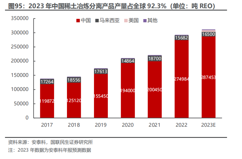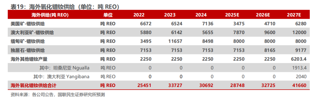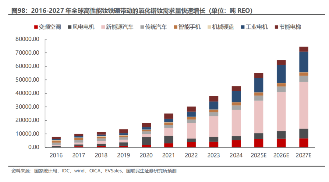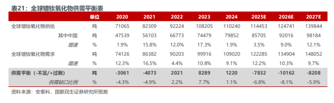 ◾ 稀土磁材:产业链以中国为中心,管控加强,国内供给增速放缓,中长期需求持续增长,稀土价格有望底部企稳反弹。国内供给端指标增长速度放缓,海外供应不稳定性上升,中长期受益于新能源汽车及节能电机等快速发展,机器人有望带动新一轮需求,需求端整体稳步增长,镨钕氧化物供给缺口或扩大。