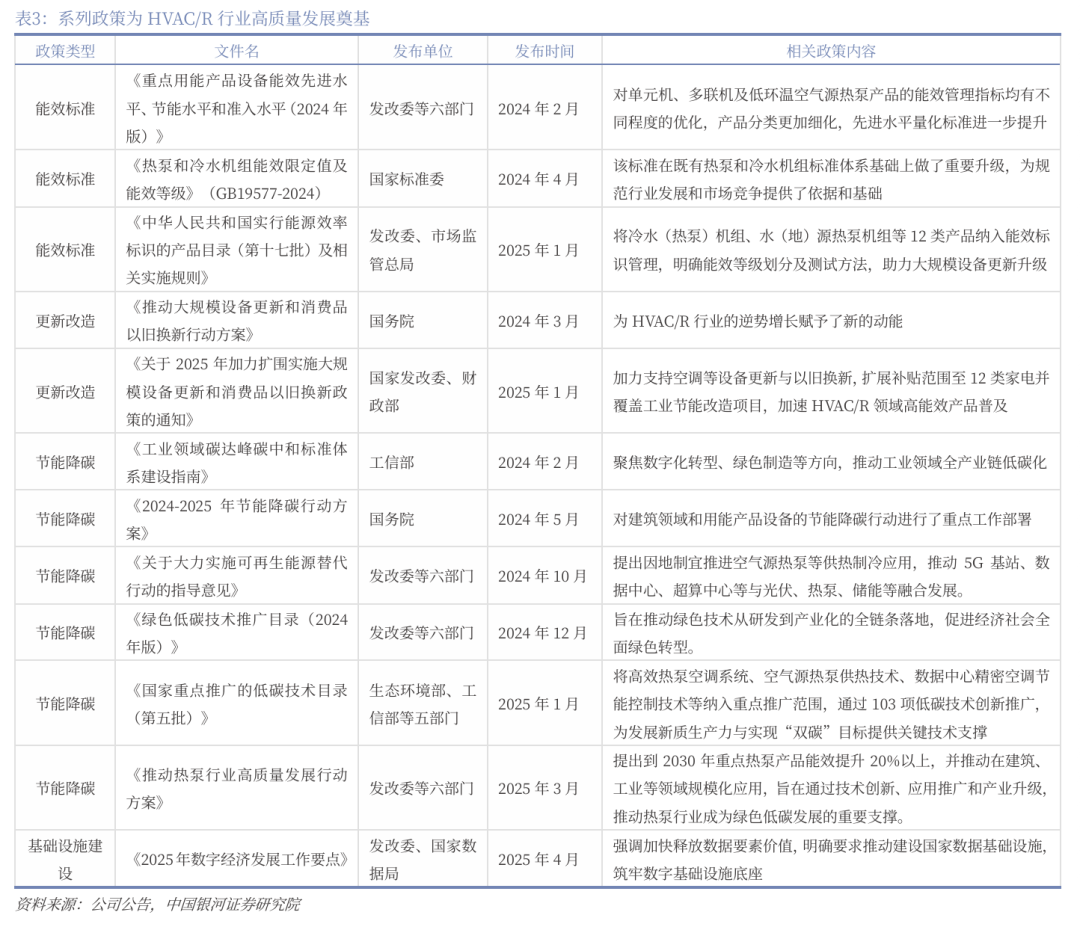 从政策端来看,在“双碳”目标持续推进、能效标准不断提升以及智能化需求加速渗透的背景下,暖通行业正处于由传统定频设备向高能效、低能耗、智能化变频产品转型升级的关键阶段。2024年以来,国家层面陆续出台多项政策,涵盖能效标准提升、更新改造、节能降碳和基础设施建设等方面,为暖通行业的高质量发展奠定基调。