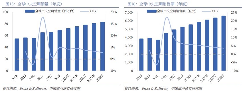 全球中央空调市场稳步增长。据Frost & Sullivan,2023年全球中央空调销售额达到5217亿元,呈现稳定增长态势。2000-2010年代,工业化发展带动中央空调需求增长,为全球市场贡献了长期且巨大的增量。2020年后,美国制造业回流刺激中央空调需求,以及全球数据中心大规模建设带动冷水机组的需求增长。