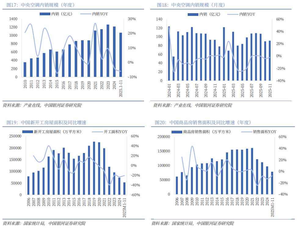国内市场,中央空调受地产市场持续低迷,工业投资步伐放缓负面影响。产业在线数据,2024年中央空调内销额1215亿元,同比下滑3.8%,主要系房地产市场持续低迷,工业投资步伐放缓,中央空调终端需求疲弱;2025年1-11月中央空调内销规模为1068亿元,同比下降6.1%。国家统计局数据,2025年1-11月,我国新开工房屋面积同比-20.5%,商品房销售面积同比-7.8%,需求恢复仍需时间。我们预计2026年公司商用空调业务仍将一定程度上受到国内地产周期低迷的影响。