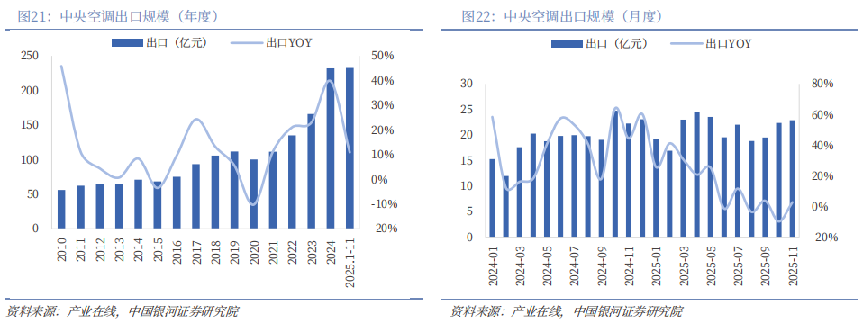 中国企业全球竞争力提升,份额提升带动出口近年较好增长。产业在线数据,2024年中央空调出口额达232亿元,同比增长39.8%;2025年1-11月,出口销售额达232亿元,同比增长10.9%,已达到2024年全年出口额规模,其中11月同比 2.8%。