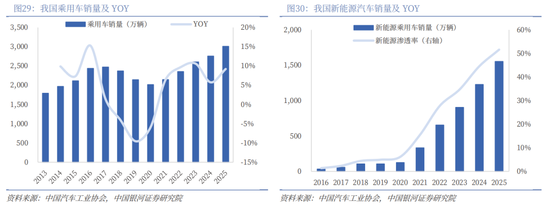 全球新能源汽车行业蓬勃发展,我国贡献全球过半产销。全球汽车行业的去碳化目标、新能源汽车技术的提升以及新能源汽车充电基础设施的发展,带动了全球新能源汽车行业快速发展。全球新能源汽车销量由2020年的520万台增加至2024年的2140万台,复合年增长率为42.7%,2020年至2024年,全球新能源汽车渗透率由6.7%上升至23.6%;而全球传统内燃机汽车销量则由2020年的7280万台减少至2024年的6920万台。国内方面,我国新能源汽车产业正处于快速成长期,贡献全球过半产销。2025年我国新能源汽车销售1554万台,新能源汽车销售渗透率同比 7pct至51.6%,渗透率快速提升。汽车以旧换新政策对新能源车补贴力度高于燃油车,叠加汽车下乡政策与购置税减免均只适用于新能源车,国内新能源车销量具备更强支撑。与此同时,智能网联和自动驾驶技术商业化正逐步展开,进一步提高新能源汽车的渗透率,推动汽车热管理系统零部件市场快速扩张。