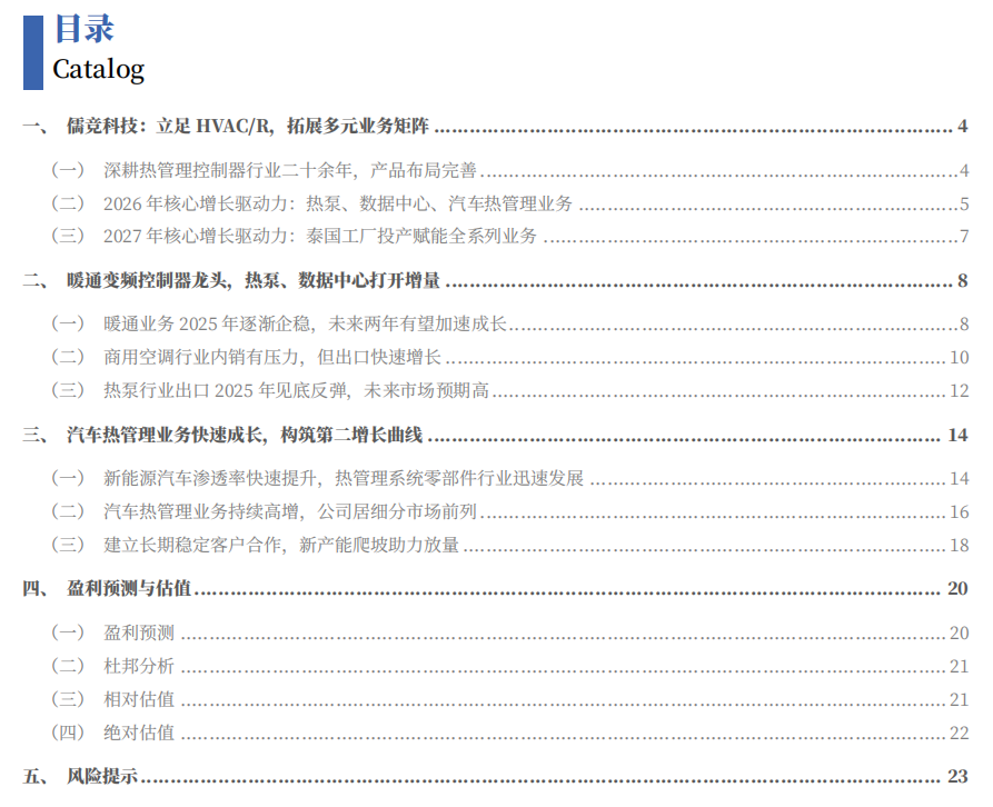 儒竞科技:暖通变频控制器龙头,向汽车热管理、工控领域拓展。公司已形成三大业务协同发展的战略:1)公司成立于2003年,以暖通设备控制器起家,是基本盘业务。下游客户包括艾默生、麦克维尔、阿里斯顿、海尔、三菱重工海尔、开利、博世等国内外大型厂商;2)2016年成立“儒竞电控”子公司进入新能源汽车热管理领域,近年持续高增,成为第二成长曲线。下游客户包括华暖通:商用空调受地产周期低迷影响,热泵、数据中心打开增长空间。2025H1,暖通业务收入4.22亿元,同比-4%,占比60%。暖通业务包括商用空调、热泵、家用空调三大板块:1)占大头的商用空调在国内地产周期低迷下,是主要拖累项,预计2026年仍将受到一定影响;2)热泵行业经历两年去库存后,2025年出口见底反弹,公司作为热泵控制器龙头,Q1-3热泵业务收入同比上升。欧洲热泵市场预期高,渗透率提升空间大,预计2026年公司热泵业务将有较好增长,并有望在2027年加速成长;3)全球数据中心市场增长强劲,公司切入数据中心赛道,构建“热管理 节能”双核心布局,增长势头良好,2026-2027年在低基数下有望明显增长域三电、上海光裕、科博乐等汽车零部件供应商;3)2014年成立“儒竞自控”子公司进入工业伺服领域,目前处于市场拓展阶段,业务体量小,未来有望随机器人行业增长逐步放量,或将成为第三成长曲线。