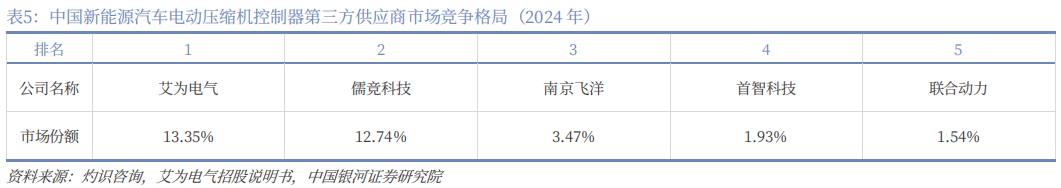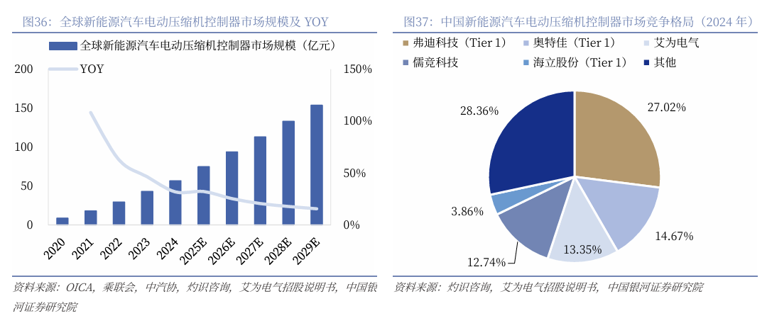 1)电动压缩机变频驱动器:电动压缩机控制器作为新能源汽车热管理系统的核心控制部件之一,全球市场规模伴随新能源汽车渗透率的提升呈现高速增长,自2020年的8.66亿元迅速攀升至2024年的56.64亿元,期间CAGR达59.9%,预计2029年将进一步增长至153.80亿元。其中,中国市场增长更为显著,自2020年的3亿元跃升至2024年的30亿元,期间CAGR高达77.2%,是重要拉动力量。从市场竞争格局来看,2024年,公司在我国新能源汽车电动压缩机控制器市场上的出货量市占率为12.74%,居行业第四;在第三方供应商中排名第二,已成为该细分赛道不可忽视的重要参与者。