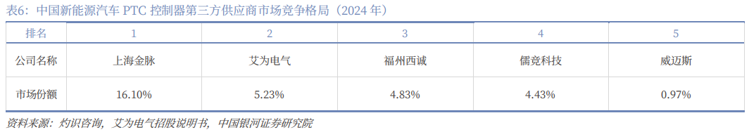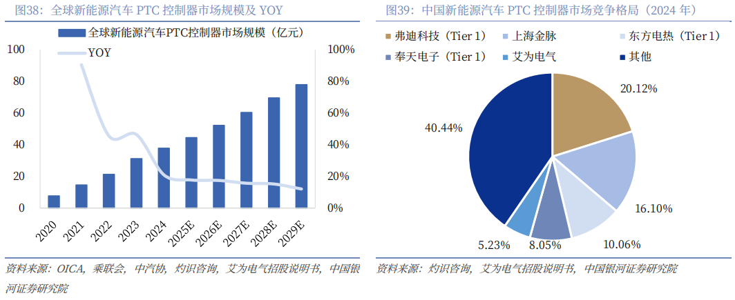 2)PTC电加热控制器:PTC控制器作为PTC加热器的重要控制部件,其全球市场规模亦随新能源汽车规模扩张而持续打开,自2020年的7.69亿元快速增长至2024年的37.76亿元,期间CAGR为48.9%。其中,中国市场增速更为突出,自2020年的2.25亿元增长至2024年的18.54亿元,期间CAGR达69.4%,显著高于全球水平,并有望于2029年达到33.41亿元。从市场竞争格局来看,2024年,公司在我国新能源汽车PTC控制器第三方供应商中排名第四,市场份额为4.43%。
