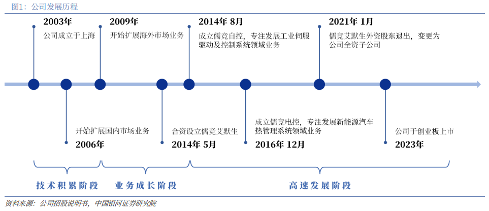 公司以HVAC/R业务起家,持续向汽车热管理、工控领域拓展业务布局。儒竞科技成立于2003年,总部位于上海,专注于电力电子及电机控制领域综合产品的研发、生产与销售,致力于为全球用户提供专业的变频节能与智能控制应用方案。公司以HVAC/R领域业务起家,在2003-2009年的技术积累阶段,先后扩展国内与海外市场,为后续发展奠定基础。2014年5月,公司与艾默生中国合资设立儒竞艾默生,公司海外热泵控制器等业务进入快速发展期;同年8月,设立儒竞自控,正式进入工业伺服驱动与控制系统领域。2016年12月,公司成立儒竞电控,切入新能源汽车热管理系统赛道,业务矩阵进一步拓展。2021年儒竞艾默生外资股东退出,变更为公司的全资子公司。2023年公司成功登陆创业板。