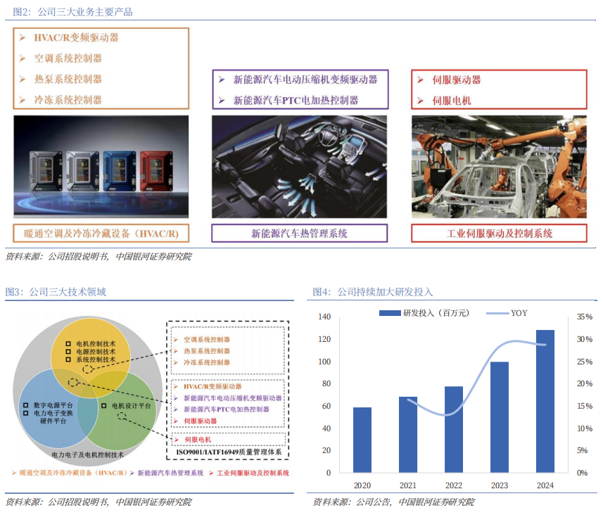 公司已形成HVAC/R、新能源汽车热管理系统、工业伺服驱动及控制系统三大业务协同发展的战略规划,积累了稳固的客户资源。公司坚持研发创新,自主构建了以电机控制、电源控制及系统控制技术、数字电源及电力电子变换硬件平台、电机设计平台为代表的三大技术领域,以支撑各业务领域的产品研发。主要产品包括HVAC/R、空调、热泵、冷冻系统控制器及变频驱动器;新能源汽车电动压缩机变频驱动器、PTC电加热控制器;伺服驱动器、伺服电机等。公司已积累众多国内外下游核心客户,例如HVAC/R领域包括艾默生、麦克维尔、阿里斯顿、海尔、三菱重工海尔、开利、博世等大型厂商;新能源汽车热管理领域包括华域三电、上海光裕、科博乐等汽车零部件供应商;工业伺服领域包括新松机器人、云华智能等。