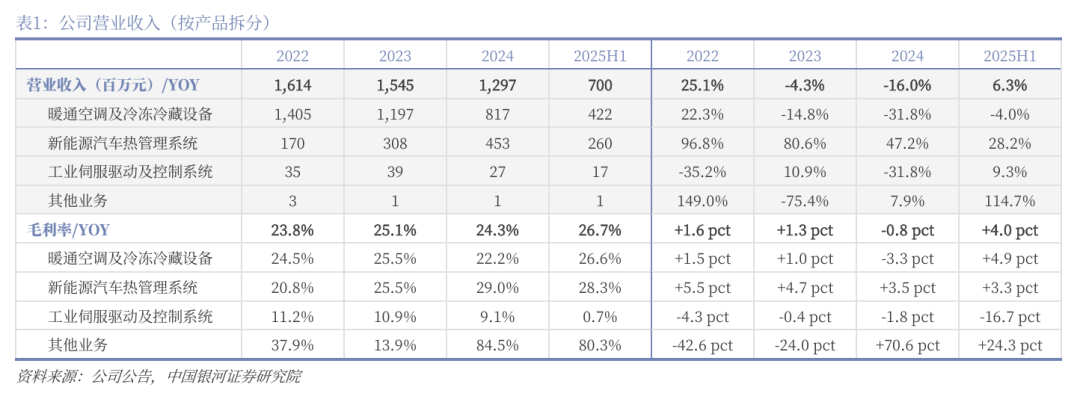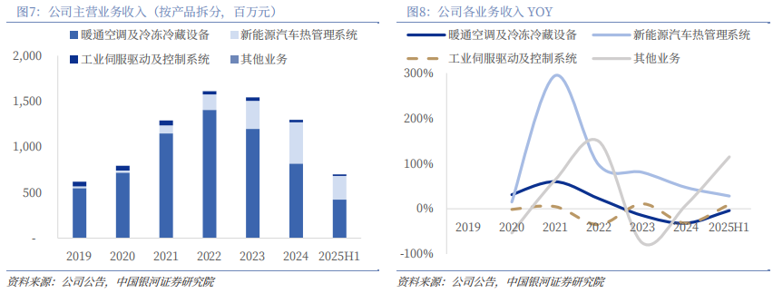 从产品结构来看,暖通业务为基本盘,新能源汽车热管理为第二增长曲线。2025H1,公司暖通业务/新能源汽车热管理业务/工业伺服业务分别实现收入4.22/2.60/0.17亿元,同比-4%/ 28.2%/ 9.3%,占比60.3%/37.2%/2.5%。其中,暖通业务在国内地产周期下行背景下,受商用空调业务拖累,但2025年全球热泵市场逐渐复苏,上半年公司热泵业务收入大幅上升;公司新能源汽车热管理业务近年持续高速增长,2025H1因公司新能源汽车电子和智能制造产业基地提前投产,受产能搬迁和爬坡的阶段性影响,增速放缓,但市占率进一步提升;工业伺服业务体量尚小,处于市场拓展阶段,25H1收入小幅增长,但已有深厚的技术积累,未来有望随行业增长逐步放量。