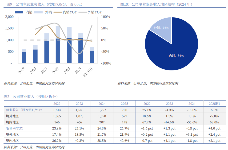 从地区结构来看,内销为主,外销受欧洲热泵行业波动影响。公司内销收入增长较为稳定,2019-2024年,自4.8亿元增长至10.9亿元,期间CAGR为17.7%;占比达84%,贡献公司主要收入利润。2025H1内销收入5.2亿元,同比-5%,主要系地产周期低迷影响。外销方面,公司产品销往北美、欧洲、东南亚等多个国家和地区,其中欧洲市场是核心市场(2022年在外销中的占比超过80%),2025H1,公司外销收入1.8亿元,同比 63%,主要系全球热泵市场去库存结束,需求迎来拐点。