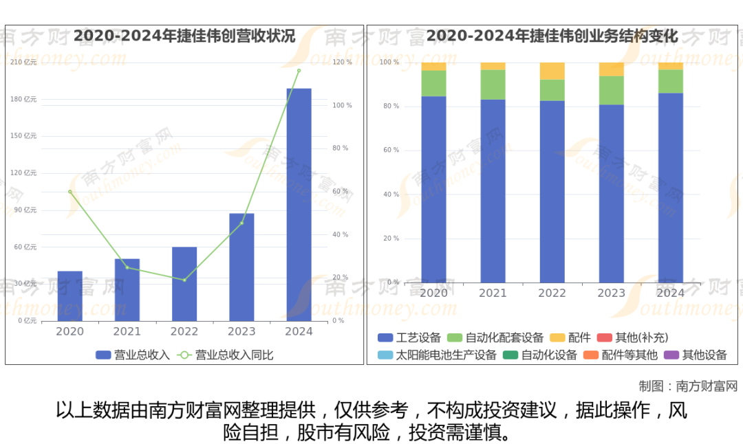 (如上图)2024年捷佳伟创公司营业总收入188.87亿,同比增长116.26%,近五年复合增长率为47.01%。