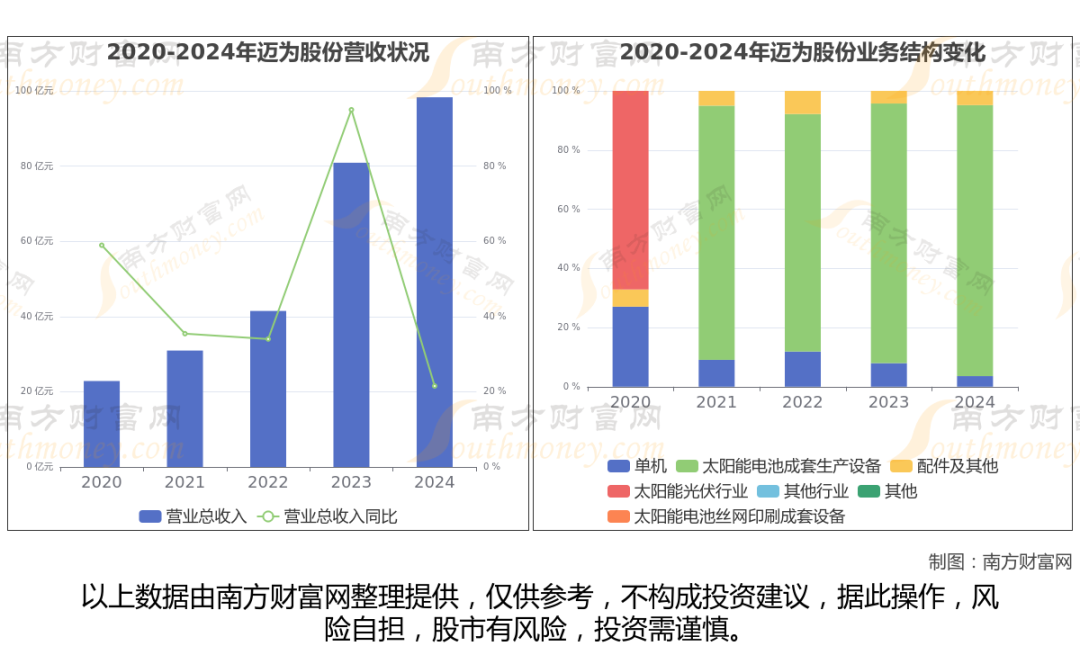 据年报数据显示(如上图),迈为股份过去一年实现营业收入98.3亿,同比增长21.53%,近5年复合年增长率44.01%。