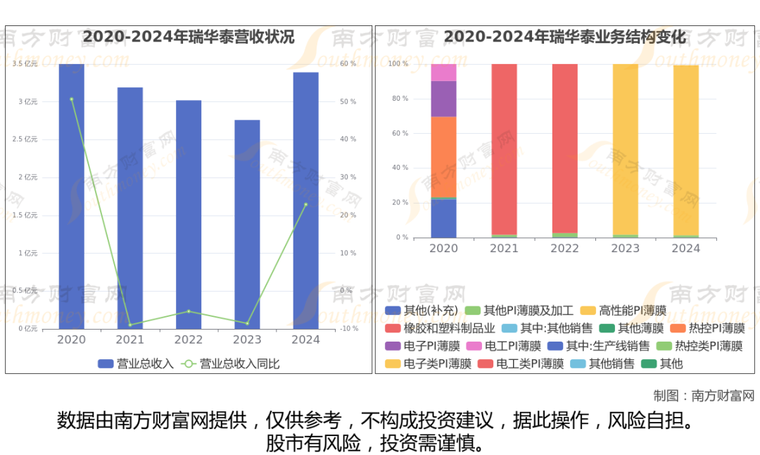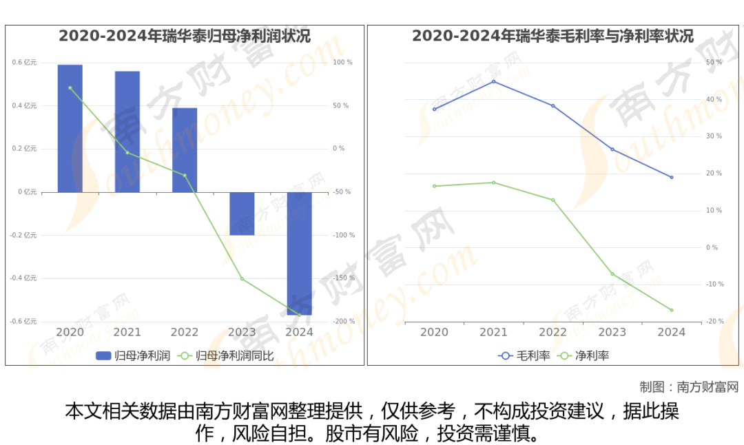 瑞华泰年报数据显示(如上图),2024年实现营业总收入3.39亿,同比增长22.88%,近5年复合年增长率-0.8%。