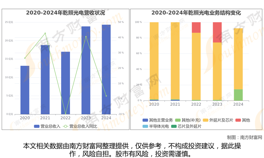 (如上图)2024年乾照光电公司营业总收入为24.33亿,同比增长1.91%,近5年复合增长率为16.61%。