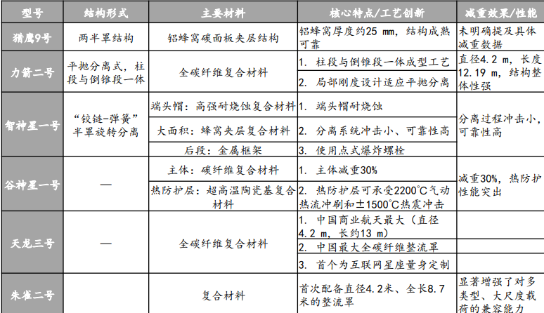 整流罩通常位于火箭的顶部。卫星整流罩形状 包括单星罩、双星罩、多星罩等。在抛弃时分 成两半的整流罩类型被称为蛤壳式整流罩。直径方面,小型的一般为1~3m,中型的为3~5m, 而大型火箭的整流罩直径一般会超过5m。质量方面,小型的一般只有几百千克量级,中型和大型运载火箭整流罩的重量都会达到吨级以上。目前国内外卫星整流罩主要有金属铆接和复合材料两大类,常用材料为铝合金、碳纤维等。