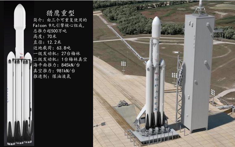 Falcon Heavy 是 SpaceX 的重型运载火箭,采用三枚 Falcon 9 一级芯级并联构型,由一个中心核心和两个侧助推器组成,全箭共配置 27 台 Merlin 发动机,起飞推力显著高于单枚 Falcon 9。Falcon Heavy 的近地轨道最大运载能力约为 63.8 吨,在现役商业火箭中处于领先水平。