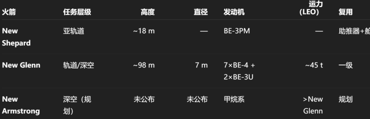New Armstrong(新阿姆斯特朗)是 Blue Origin 规划中的超重型深空运载火箭,定位于月球与更远深空任务,目标运 力显著高于 New Glenn。目前仍处于概念/前期规划阶段,公开信息有限,预计延续蓝色起源的液氧-甲烷(BE-4 系)与 可重复使用技术路线。