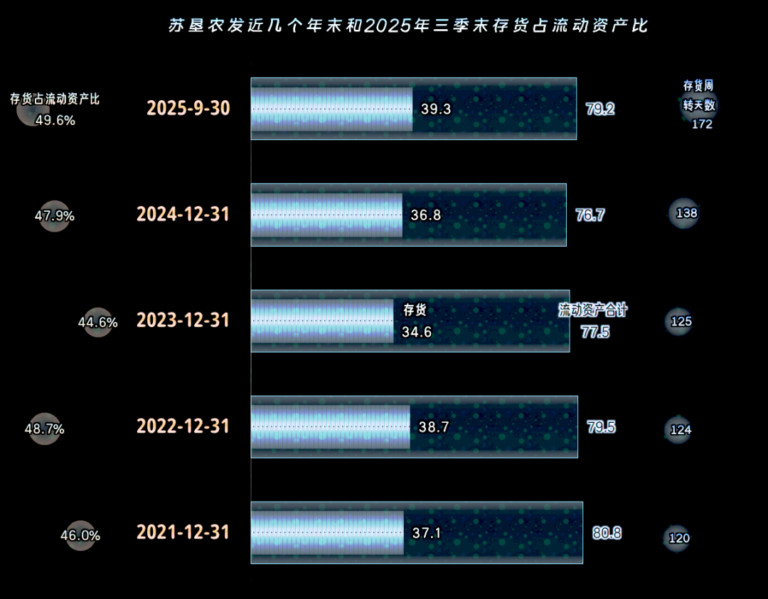 苏垦农发的存货规模在2023年末大幅下降,这样就稳住了“存货周转天数”不至于大幅上升,也回收了运营资金。只是后续期末的存货又增长起来了,当然也不可避免地导致存货周转效率下降。