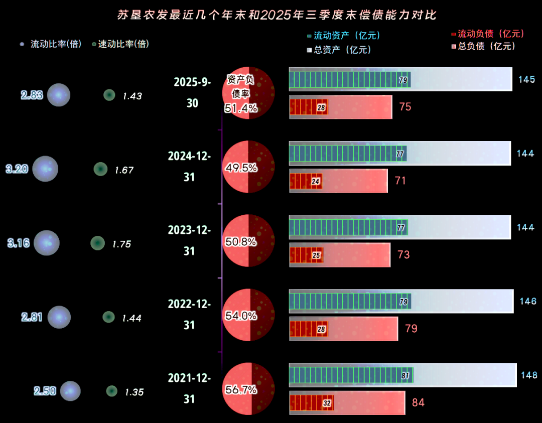 苏垦农发的长短期偿债能力都是极强的,毕竟只是营收和净利润持续下跌,总体上仍是较好的盈利状态,这方面他们完全有条件自己控制在一个相对保守的水平,既不至于严重拖累净资产收益率,又不至于把自己的财务风险弄得太高了。
