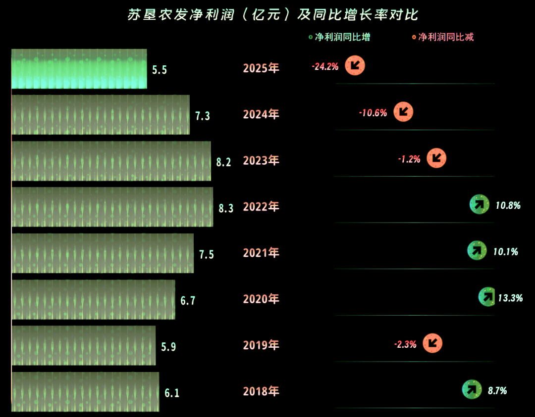 前两年的净利润下跌幅度并不算大,但2025年猛跌近1/4,这已经比前七年都低了。我们经常在说,营收下跌时的净利润是很难稳住的,连续营收下跌时的净利润,几乎就不可能稳住,苏垦农发当然不能例外。