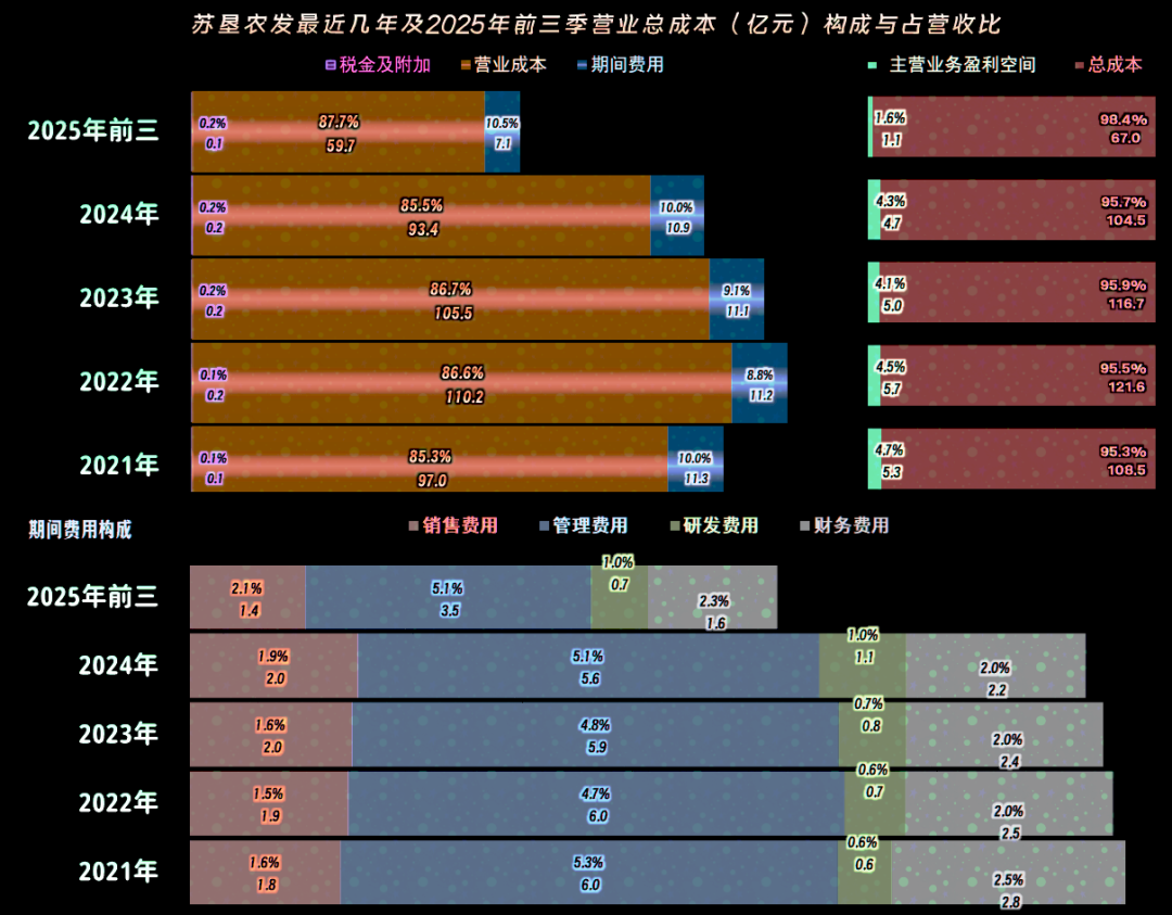 苏垦农发并非没有采取降低期间费用的措施,只是每年降1%出头的幅度,还是慢了点。至少营收下跌的速度更快,期间费用占营收比就只有连续三年提升了。