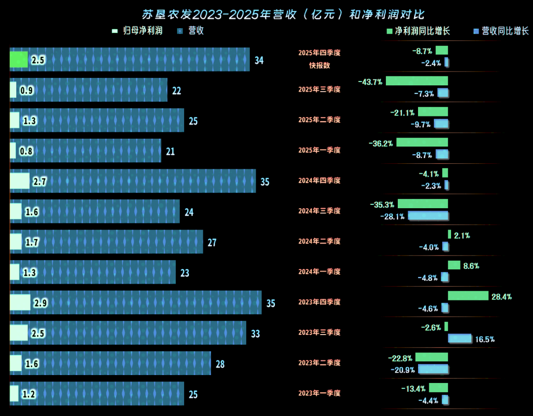 2025年的整个经营形势,都是向下的趋势,但2025年四季度的营收和净利润的下跌幅度都明显下降,还不能说有反弹的趋势,但隐约有点快找到支撑的迹象了。具体情况当然还得看2026年的市场和苏垦农发自身的努力了。