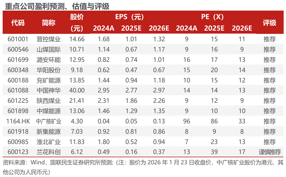 投资建议:标的方面,我们推荐以下投资主线:1)高现货比例弹性标的,建议关注晋控煤业、山煤国际、潞安环能、华阳股份、兖矿能源。2)行业龙头业绩稳健,建议关注中国神华、陕西煤业、中煤能源。3)受益核电增长,强α稀缺天然铀标的,建议关注中广核矿业。