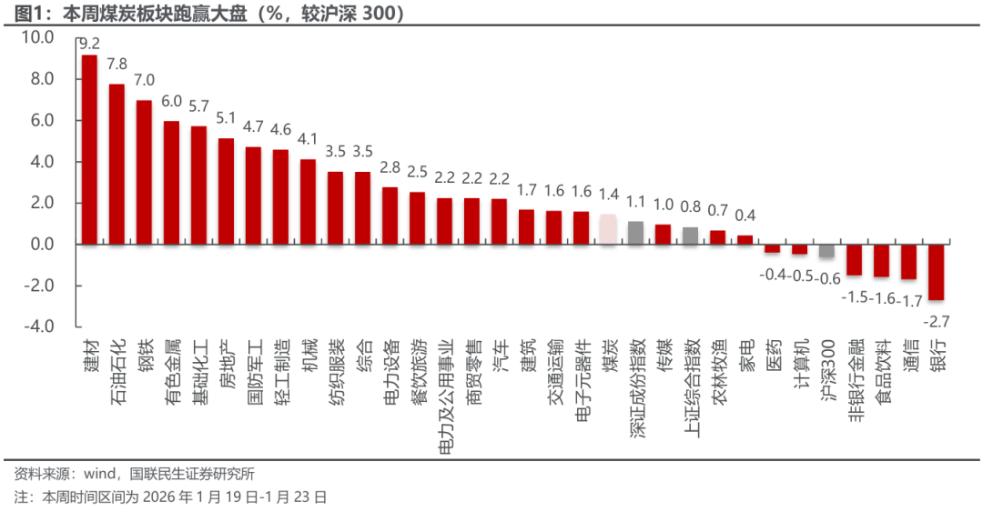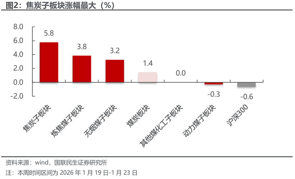 截至1月23日,本周中信煤炭板块周涨幅1.4%,同期沪深300周跌幅0.6%,上证指数周涨幅0.8%,深证成指周涨幅1.1%。