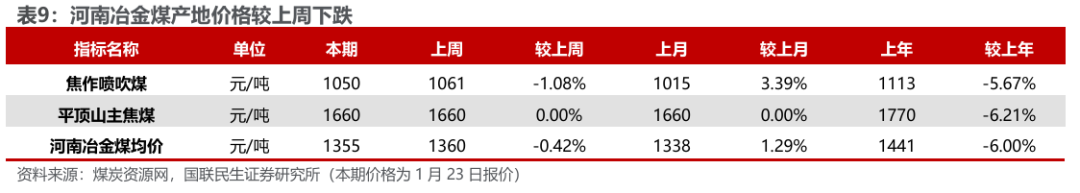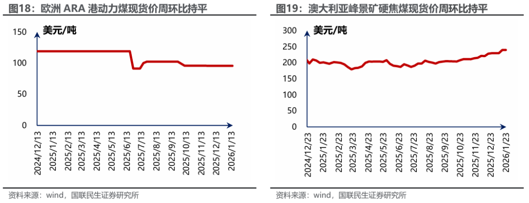 港口及产地主焦煤价格上涨。据煤炭资源网数据,截至1月23日,京唐港主焦煤价格为1800元/吨,周环比上涨30元/吨。截至1月22日,澳洲峰景矿硬焦煤现货指数为242.60美元/吨,周环比上涨2.0美元/吨。产地方面,山西低硫周环比上涨19元/吨,柳林低硫周环比上涨30元/吨,长治喷吹煤周环比下跌10元/吨,山西高硫、灵石肥煤、济宁气煤周环比持平。