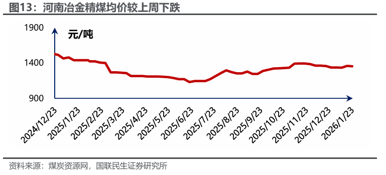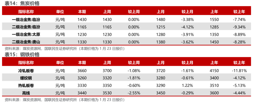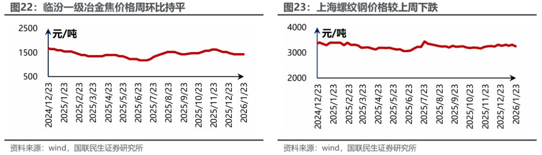 焦炭价格持稳。据Wind数据,截至1月23日,唐山二级冶金焦市场价报收于1330元/吨,周环比持平;临汾二级冶金焦报收于1165元/吨,周环比持平。港口方面,1月23日天津港一级冶金焦价格为1560元/吨,周环比持平。