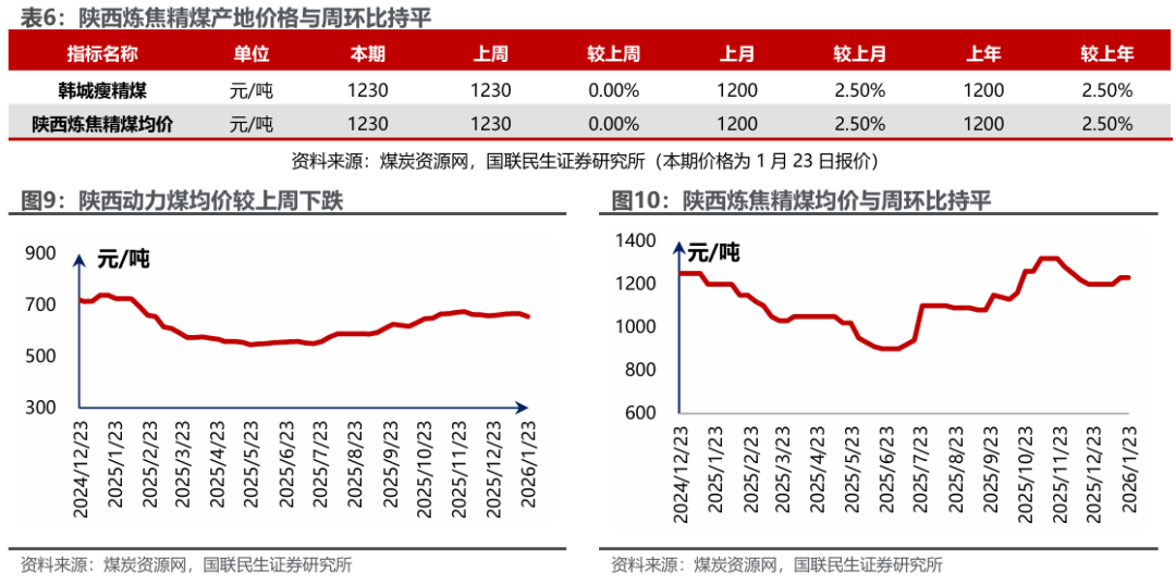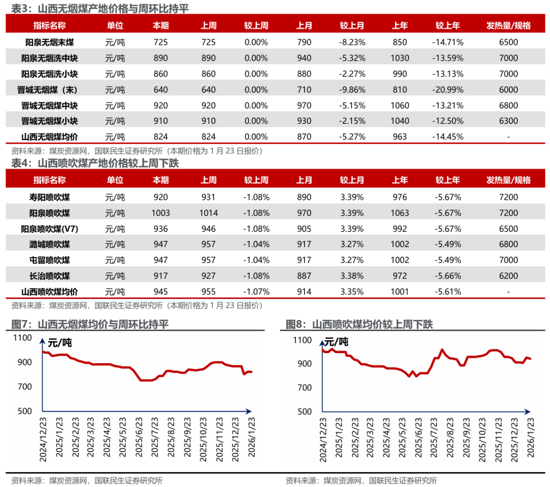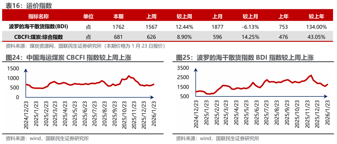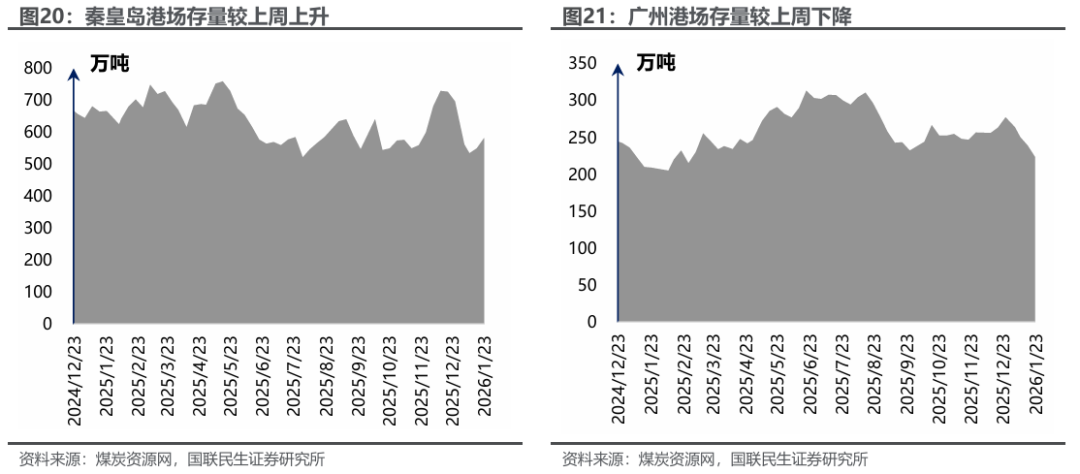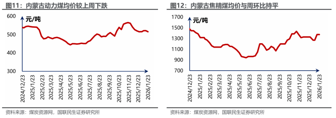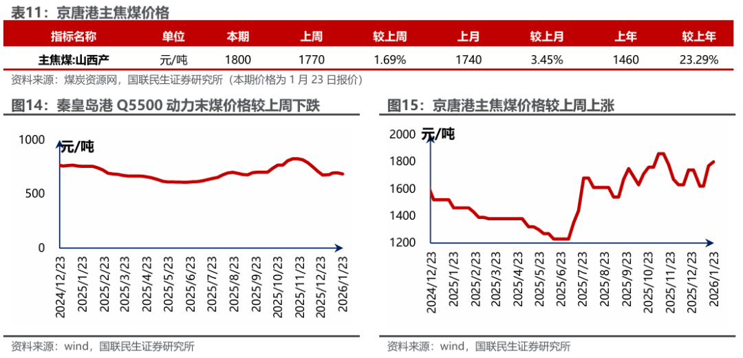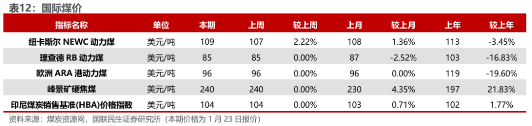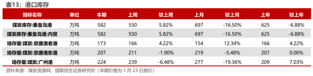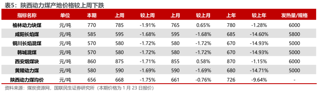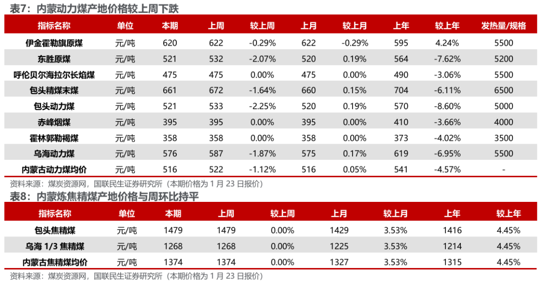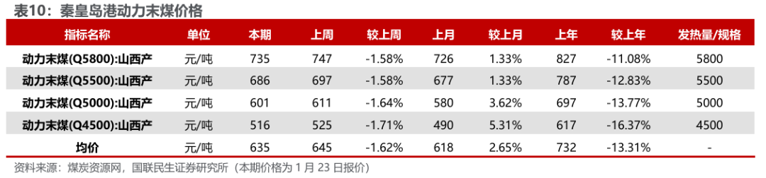港口及产地煤价下滑。煤炭资源网数据显示,截至1月23日,秦皇岛港Q5500动力煤市场价报收于686元/吨,周环比下跌11元/吨。产地方面,据煤炭资源网数据,山西大同地区Q5500报收于564元/吨,周环比下跌5元/吨;陕西榆林地区Q5800指数报收于589元/吨,周环比下跌7元/吨;内蒙古鄂尔多斯Q5500报收于526元/吨,周环比下跌11元/吨。