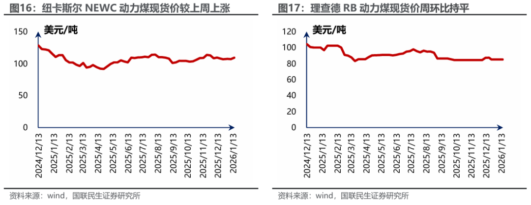 电厂周均日耗周环比上升明显,可用天数减少,化工需求环比微降。据CCTD数据,1月23日二十五省电厂日耗为687.6万吨,周环比上升57.6万吨,同比上升111.8万吨;周均日耗659.4万吨,周环比上升39.1万吨,同比上升71.1万吨;可用天数17.9天,周环比减少2.2天,同比减少4.1天。截至1月23日当周化工行业合计耗煤745.65万吨,同比增长7.2%,周环比下降0.9%。
