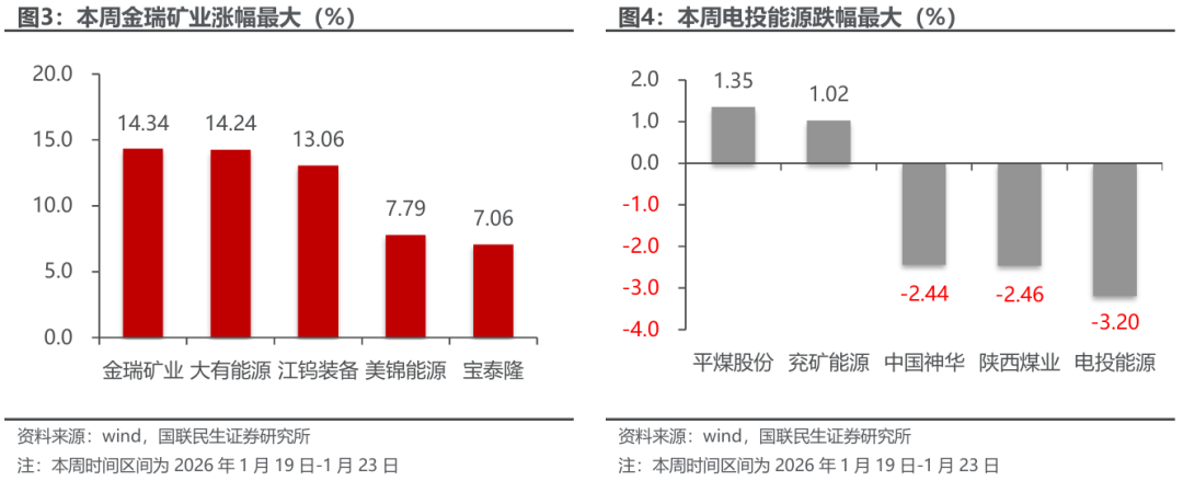 本周金瑞矿业涨幅最大。截至1月23日,煤炭行业中,公司周涨幅前5位分别为:金瑞矿业上涨14.34%,大有能源上涨14.24%,江钨装备上涨13.06%,美锦能源上涨7.79%,宝泰隆上涨7.06%。