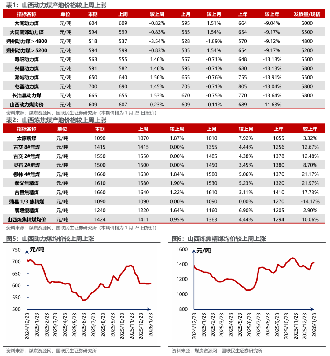 供给收紧叠加补库需求仍存,煤价有望趋稳反弹。本周港口及产地煤价偏弱运行,供给端,伴随春节将近,部分民营煤矿陆续放假,供应有所收缩;需求端,寒潮影响下电厂日耗周环比大幅上升,港口库存明显去化,但因电厂以消耗库存和长协拉运为主,对现货煤价提振有限。当前市场供需两弱,日耗高位下煤价跌幅有限,考虑节前仍有补库需求,价格亦有望趋稳反弹。2025年,国内原煤产量48.3亿吨,同比 7282万吨( 1.2%),进口总量4.90亿吨,同比-5243万吨(-9.6%),供给端净新增2039万吨。伴随产能核减开启以及印尼2026年产量目标大幅下降,供给收缩力度加强并回到常态化监管下,煤价有望回到 2023-2024 年供需基本平衡状态,价格回升至750-1000元/吨区间季节性震荡运行。板块方面,供需改善,现货比例高、资产负债表改善标的占优,同时山西省2024年已完成超产治理,受本轮“限超产”影响最小,建议关注山西标的。