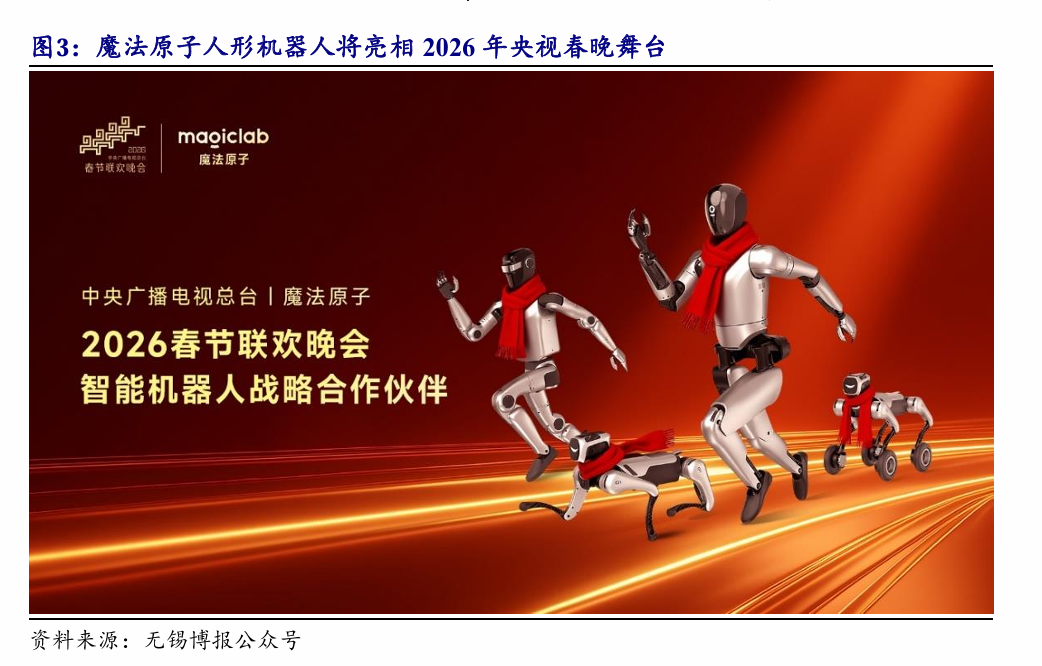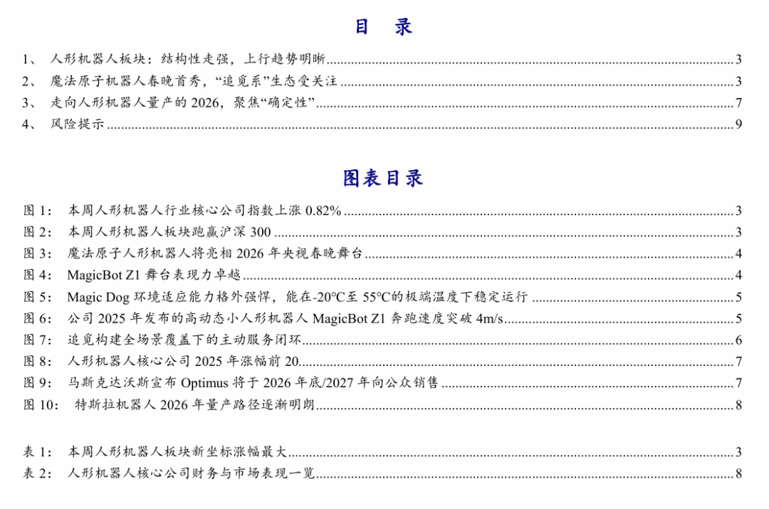 本周人形机器人板块结构性走强,核心标的获得资金关注,产业主要驱动:(1)马斯克在达沃斯宣布Optimus将于2026年底至2027年公开销售,全球人形机器人产业正驶入交付倒计时阶段;(2)“魔法原子机器人”将亮相2026年央视春晚舞台,有望大幅提升人形机器人的国民认知度及市场普及进程;(3)宇树科技披露2025年实际出货量突破5500台,量产能力和产业兑现力得到实质性验证。人形机器人行业正在跨越技术验证门槛,开启量产落地新纪元,为板块中长期上行奠定坚实基础。