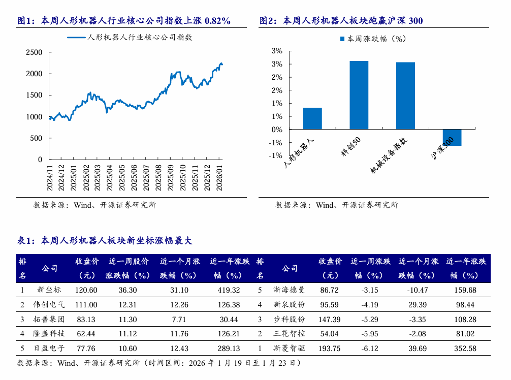 近期人形机器人板块指数呈震荡向上走势,量能温和放大,进入震荡上行通道。本周(1月19日-1月23日,全文同)沪深300指数微跌0.62%,科创50指数上涨2.62%;人形机器人核心公司指数上涨0.82%,跑赢沪深300指数。周涨跌幅榜排名前五的是:新坐标(36.30%)、伟创电气(12.31%)、拓普集团(11.30%)、隆盛科技(11.12%)、日盈电子(10.60%);周涨跌幅最后五位的是:斯菱智驱(-6.12%)、三花智控(-5.95%)、步科股份(-5.29%)、新泉股份(-4.19%)、浙海德曼(-3.15%)。