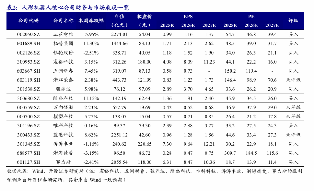 2026年跨越“1-10”拐点,走向“10-100”,核心是“量产和商业化”,我们认为,应更加关注“订单和产能建设”为核心的强确定性标的:(1)结构件:受益标的:模塑科技、凯众股份、蓝思科技、旭升集团、长盈精密;(2)轴承:推荐五洲新春,受益标的:万向钱潮;(3)头部总成:受益标的:蓝思科技;(4)关节总成:受益标的:拓普集团、三花智控;(5)灵巧手:推荐震裕科技、五洲新春、骏鼎达,受益标的:浙江荣泰、日盈电子、恒勃股份;(6)行星滚柱丝杠:推荐震裕科技、五洲新春,受益标的:恒立液压;(7)减速器:推荐隆盛科技;((8)电机:受益标的:金力永磁、德昌股份、恒帅股份、伟创电气、步科股份、雷赛智能;(9)电子皮肤及覆盖材料:受益标的:日盈电子、岱美股份、恒辉安防;(10)检测和标准化:推荐标的:集智股份,受益标的:双元科技。