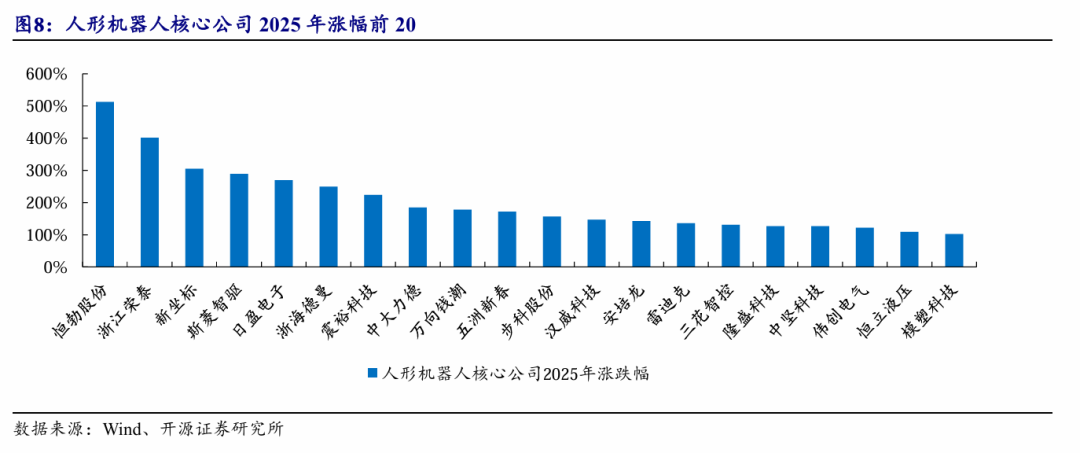 2025年产业“0-1”走向“1-10”,核心是“技术收敛”,寻找技术端的确定性和升级方向。人形机器人核心标的中,2025年涨幅居前的是:(1)“强确定性”:零部件高价值量与量产预期清晰的细分环节龙头,如丝杠(五洲新春、浙江荣泰、震裕科技)、电机(步科股份)等。(2)技术升级方向,如Peek(恒勃股份)、灵巧手(日盈电子)。在此过程中早期纯题材标的关注度下降,从“送样”到“配合开发”再到“产能建设”逐渐缩圈并走向清晰。