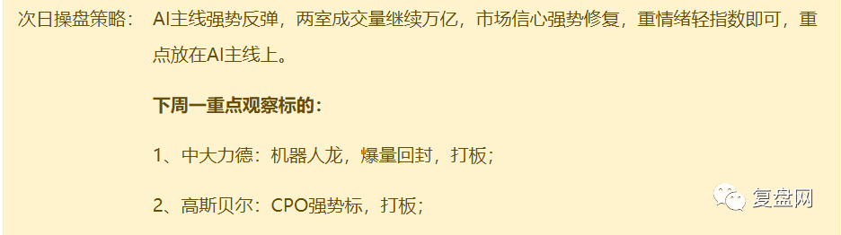 昨日复盘策略1:中大力德:机器人龙,这个爆量回封的板是可以打的,而且板的质量不错,明日有晋级的可能。策略2:高斯贝尔:CPO强势标,高开下杀,不用看直接放弃即可。