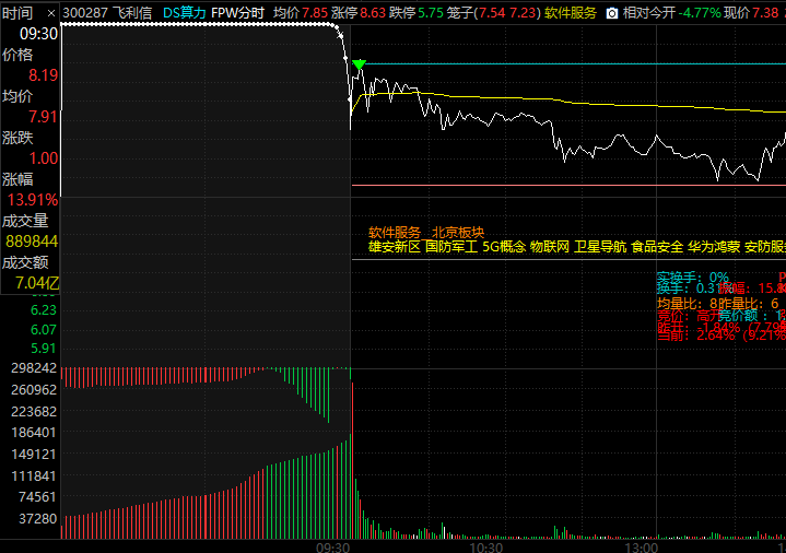 【飞利信】DS算力,竞价爆量高开,符合模式买点,可惜被光线传媒和梦网科技带崩了,冲高回落,日内-4.7%中面,明日有修复预期。
