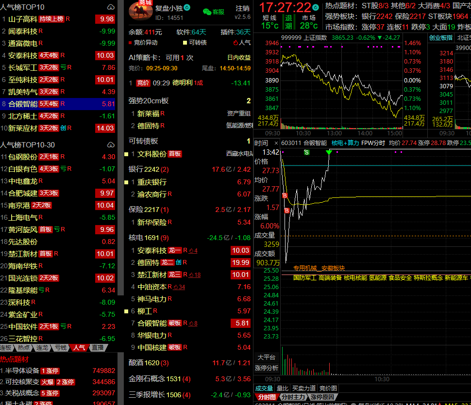 【合锻智能】核聚变龙,竞价没能大单顶一字,也是不及预期,开盘瀑布杀,反弹做T,炸板后没有回封,目前死亡换手,明日被核预期,但如果明日指数反弹也有反包的可能,继续观察。