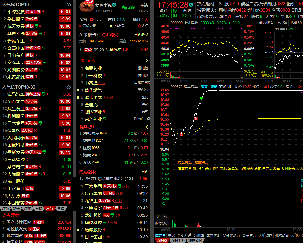 【海马汽车】海南人气标 + 竞价爆量高开 + 主线分歧预期,符合模式买点,早盘强势涨停,可惜尾盘有资金抢跑,日内+4.2%中肉,明日需要弱转强方能晋级。