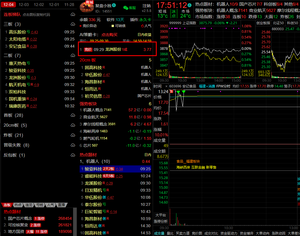 【安记食品】福建+消费龙+昨爆量晋级+竞价爆量高开+开盘弱转强,符合昨日策略买点,板上打板,可惜板上多次炸板,明日要pk太阳电缆,继续观察。