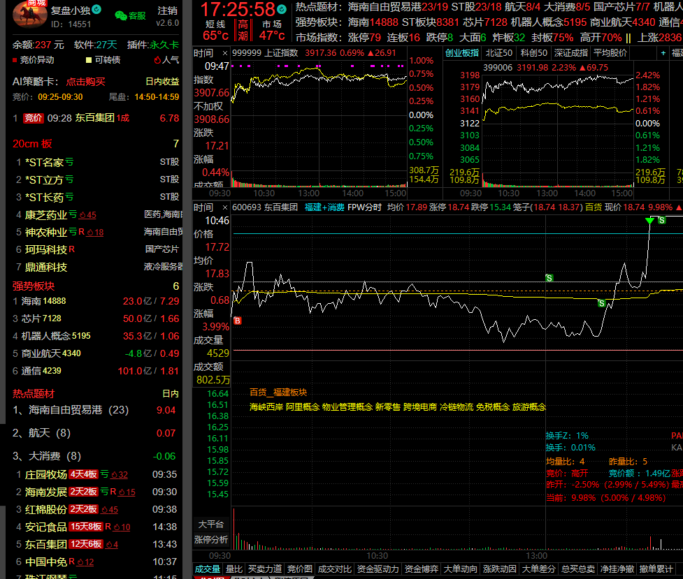 【东百集团】消费龙+福建+人气核心+竞价超预期爆量高开,符合模式买点,日内+6.8%中肉,明日如果海南板块强分歧,依旧有晋级的预期,继续重点观察。