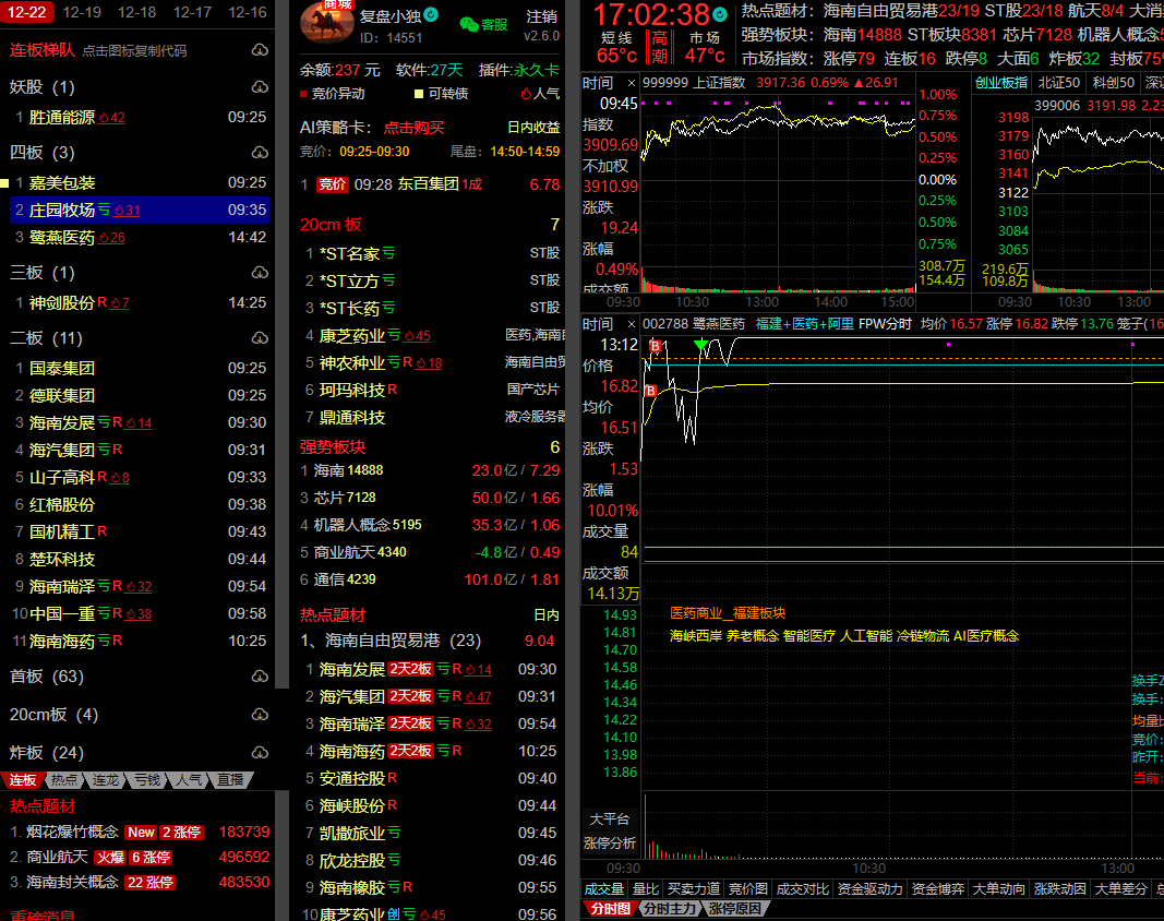 【鹭燕医药】福建+医药+4B,竞价高开4.5%,严重不及预期,但开盘能够强势往上,半路跟进,板上加仓,可惜日内超级大烂板,明日需要弱转强才行,但这个严重依赖海南板块的分歧程度,如果强分歧,依旧有可能晋级。