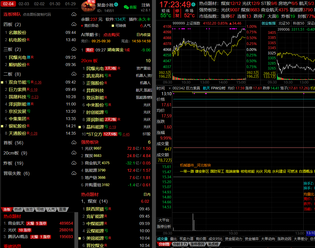 题材上,煤炭、光伏爆发涨停潮,但煤炭属于一日游题材,暂时不看,日内最强负反馈的无疑是AI应用无疑,主要原因是腾讯利空影响,看下明日是否有修复的机会,目前阶段很难发育新主线,那么继续在老主线择机找寻机会,重点关注黄金有色、航天、AI等方向。