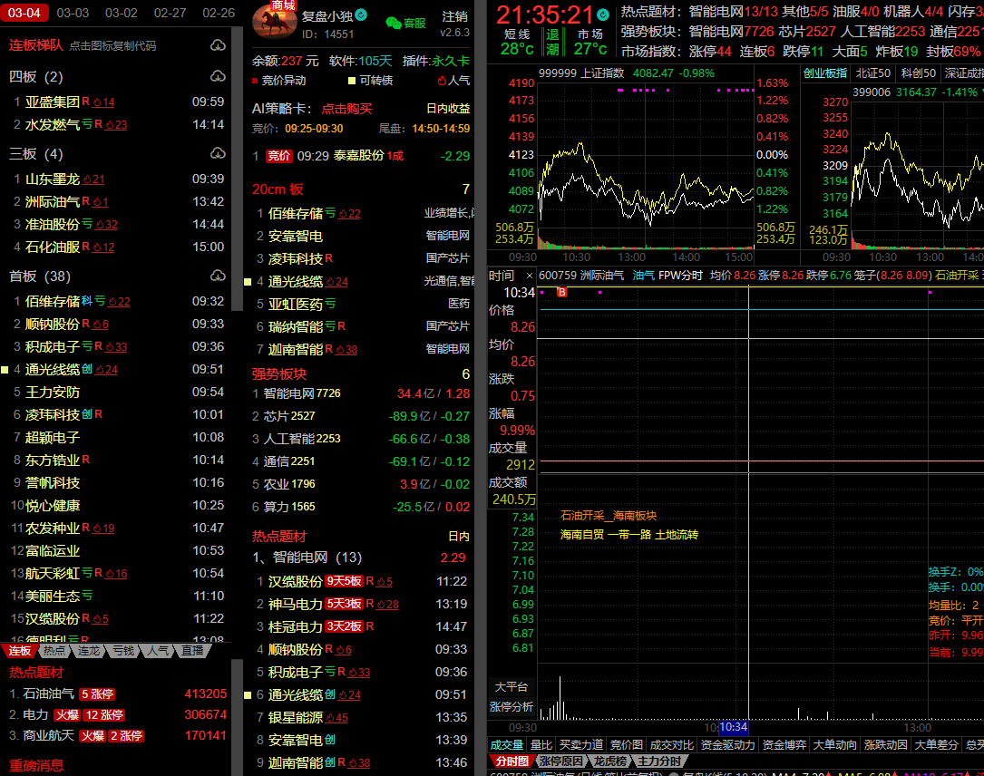 题材上,油气板块超级负反馈,明日有延续分歧预期,日内表现最为亮眼的是电力,目前市场轮动节奏加快,重点关注多日分歧的主线题材即可。