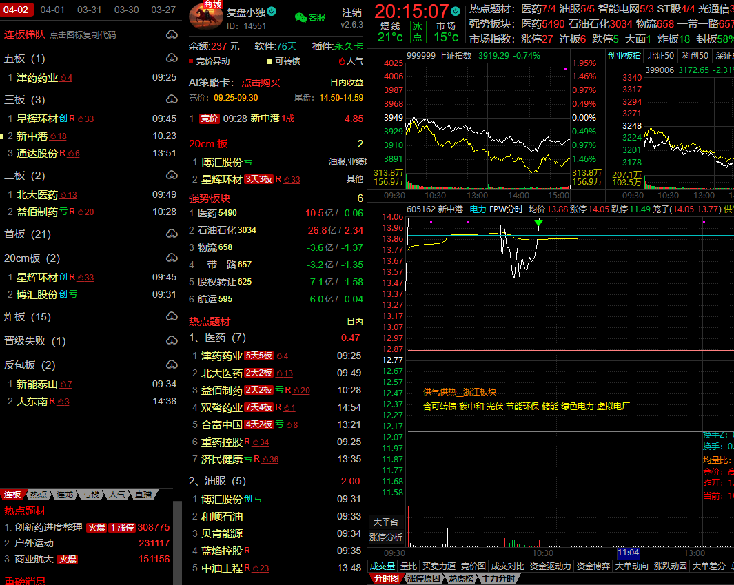 题材上,医药板块弱分歧,电力板块弱修复,其他科技板块全部都是兑现预期,目前市场没有主线题材,轮动行情,操作难度非常大。