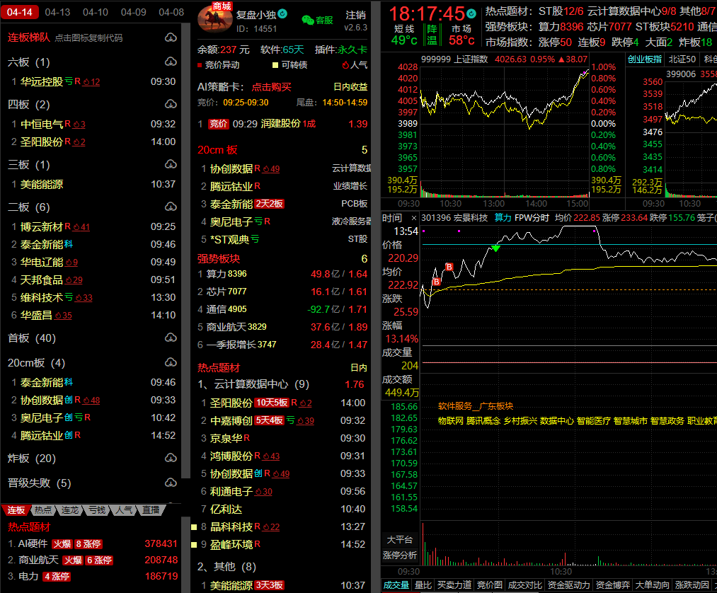 【宏景科技】算力20cm强势标 + 竞价大高开+创新高,开盘小幅分歧后,过左高半路跟进,可惜炸板后没能回封,日内+2.3%小肉,目前量价关系依旧不错,明日择机了结。
