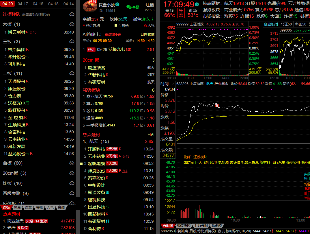 【中复神鹰】航天强势标 + 开盘爆量起势 + 即将新高 + 航天板块非常强势,半路跟进,日内+2.8%小肉,明日依旧有高溢价预期。
